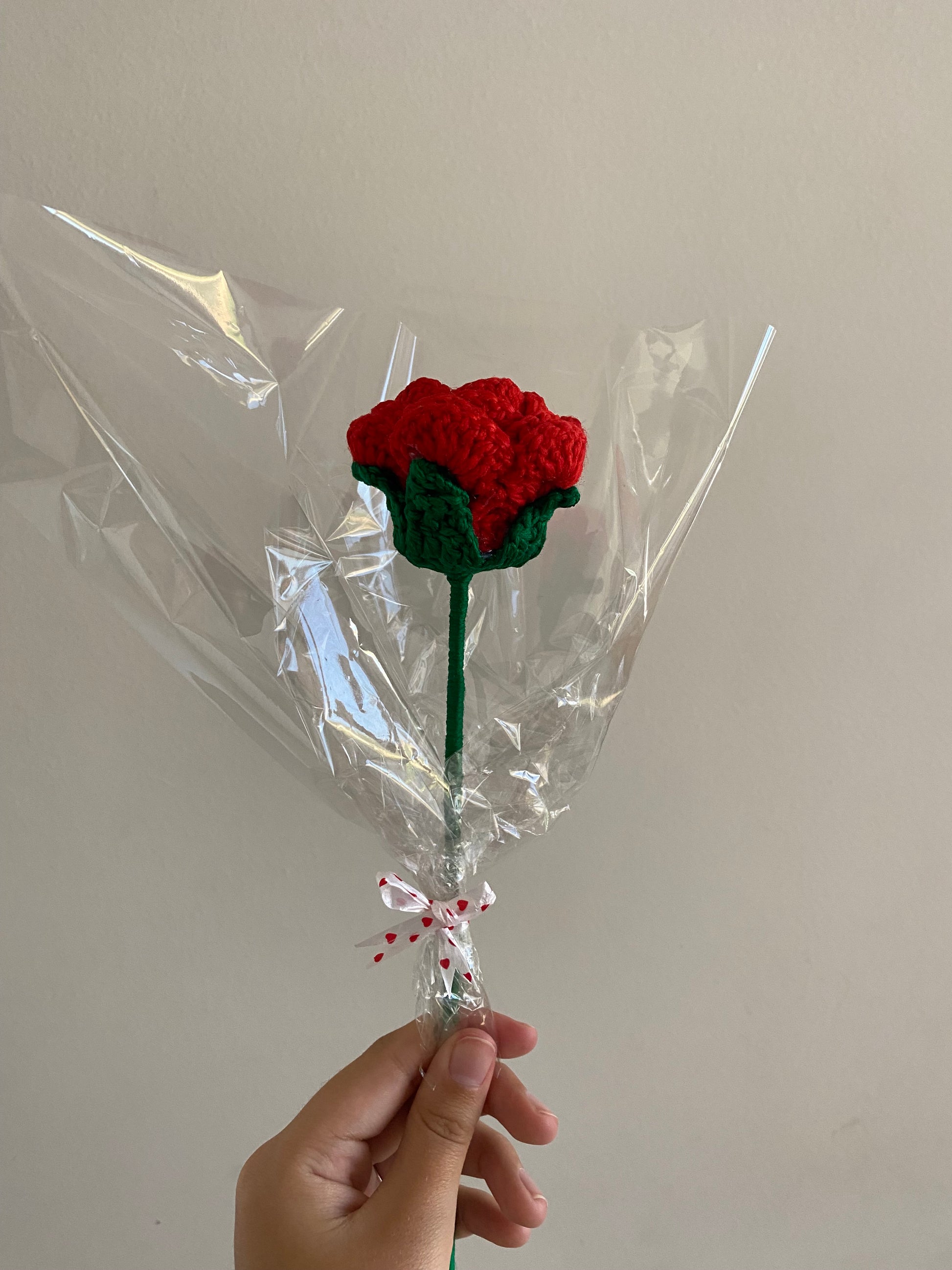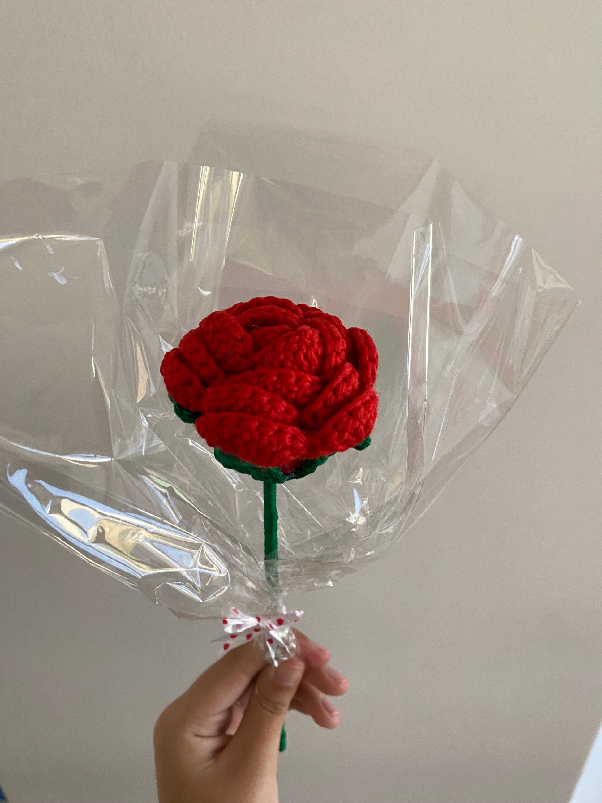 Delicately handcrafted, this crochet rose is a timeless symbol of love and elegance. Made with soft, high-quality yarn, each petal is carefully shaped to mimic the natural beauty of a real rose. The sturdy stem is wrapped for a realistic touch, making it perfect for gifting, decor, or special keepsakes. Unlike fresh flowers, this rose will never wilt, allowing you to cherish its beauty forever. Available in a variety of colors to match any occasion, it's the perfect way to express love, appreciation, or admiration.